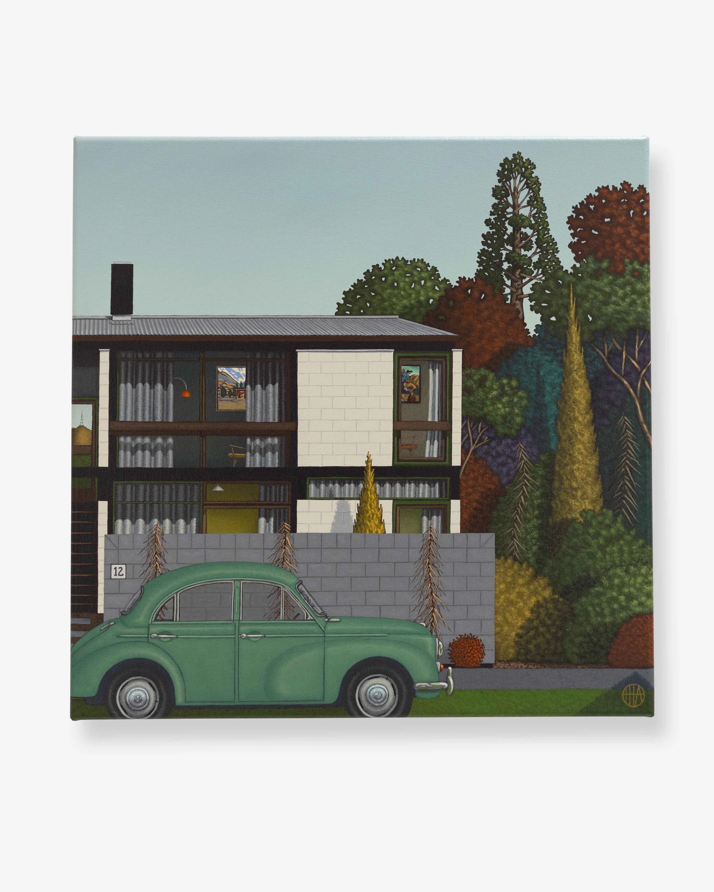 An artistic style heavily influenced by Art Deco design, Ōtautahi-based painter Hamish Allan recurrently renders deliciously stylised regional landscapes and domestic settings. Each visually precise composition incorporates abstract symbolism that references New Zealand’s cultural identity.