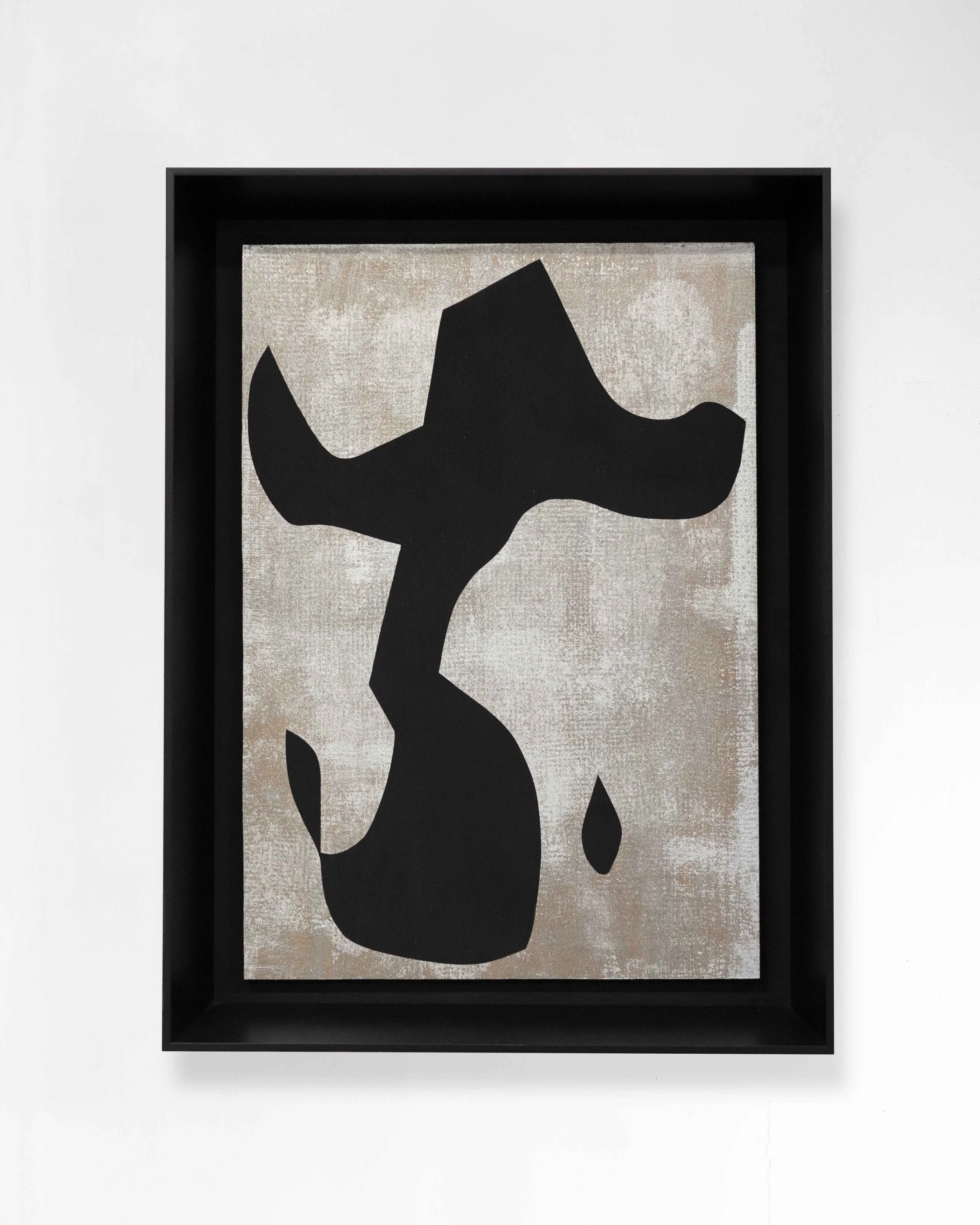 Soltero’s art making process, and the structured composition of his works, is heavily inspired by his background in graphic design. The artist creates a draft layout for his final compositions: a calculated arrangement of printed and hand-drawn abstract letterforms, which are digitised and reconfigured. The completed image is re-printed, hand traced, and stencilled before rich blacks and metallic paints are applied.